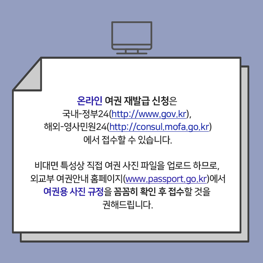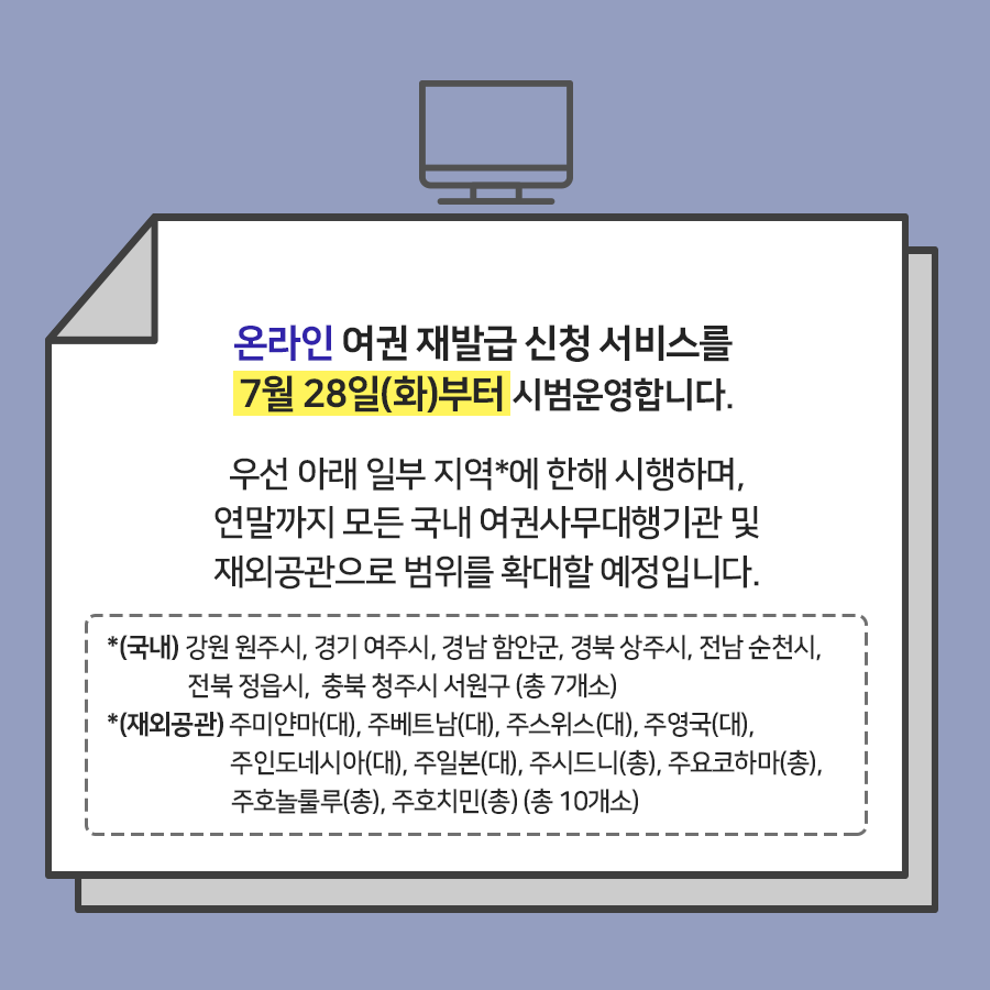 연간 여권 발급 건수 4.7백만여 건! 우리 국민의 여권 민원 편익 증대를 위해 '온라인 여권 재발급 신청' 시범운영을 7월 28일(화)부터 시행합니다.